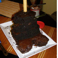 The second cake was out of the oven shortly thereafter and I went to work layering. This proved to be more difficult than I had anticipated as cake, while delicious, isn’t very sturdy. I’d hoped the icing between the layers would act as a kind of quick-drying cement. But, I was wrong.