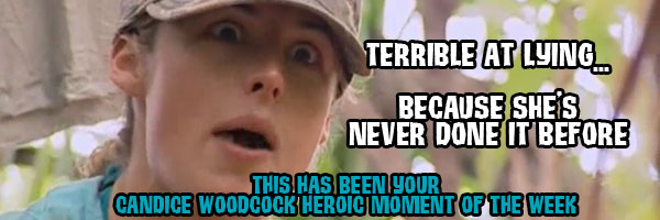 I was surprised that no one called Candice out on her wide-eyed “I didn’t even have time to think about it” comment. She was alone on an island overnight. She had nothing but time to think! Even if she was trying to meet basic survival needs for the night, you can still think while you are doing those things. The average person would be thinking of nothing but “Why me?”