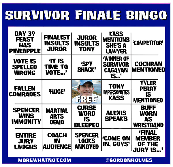 Where does the time go? It seems like just yesterday that I was predicting that Spencer and Tony would be the first ones eliminated from “Survivor: Cagayan.” And now here I am, prepping a finale bingo that features the two of them heavily.