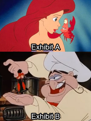 Is Sebastian some kind of magical crab that can change sizes at will? Does he shrivel up when he’s about to be eaten? Doubtful. Because that’s the exact opposite of what most wild animals do when confronted with danger. Most will puff up to scare off their predators.